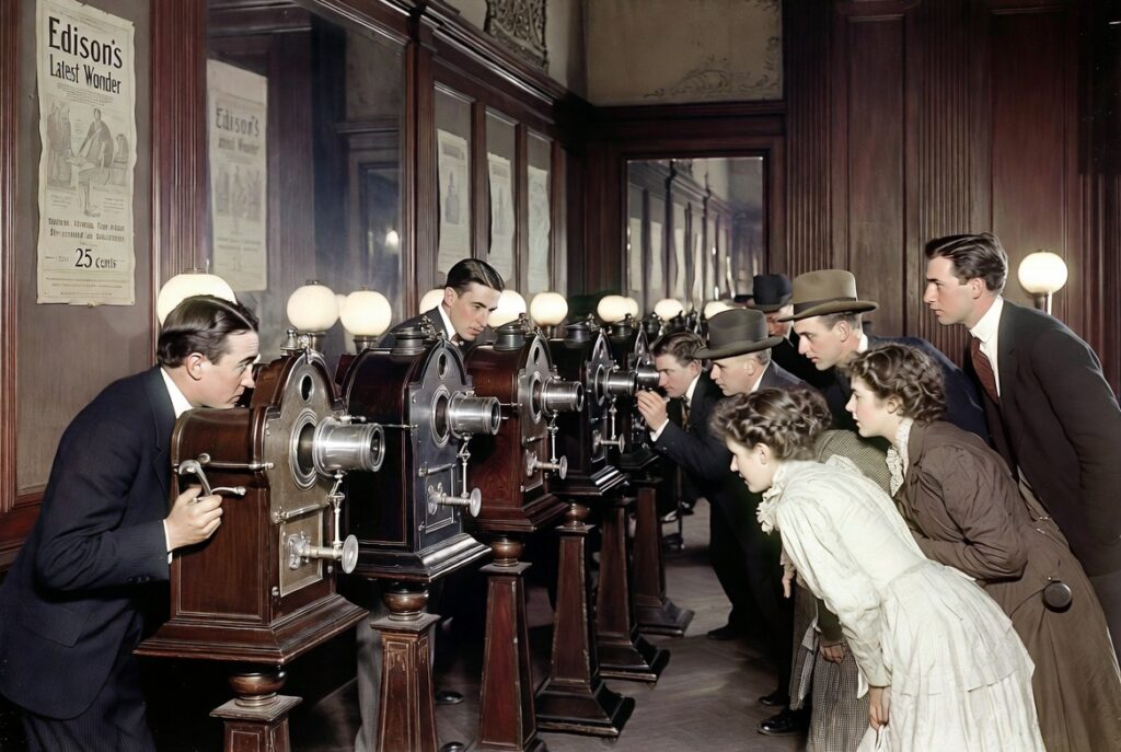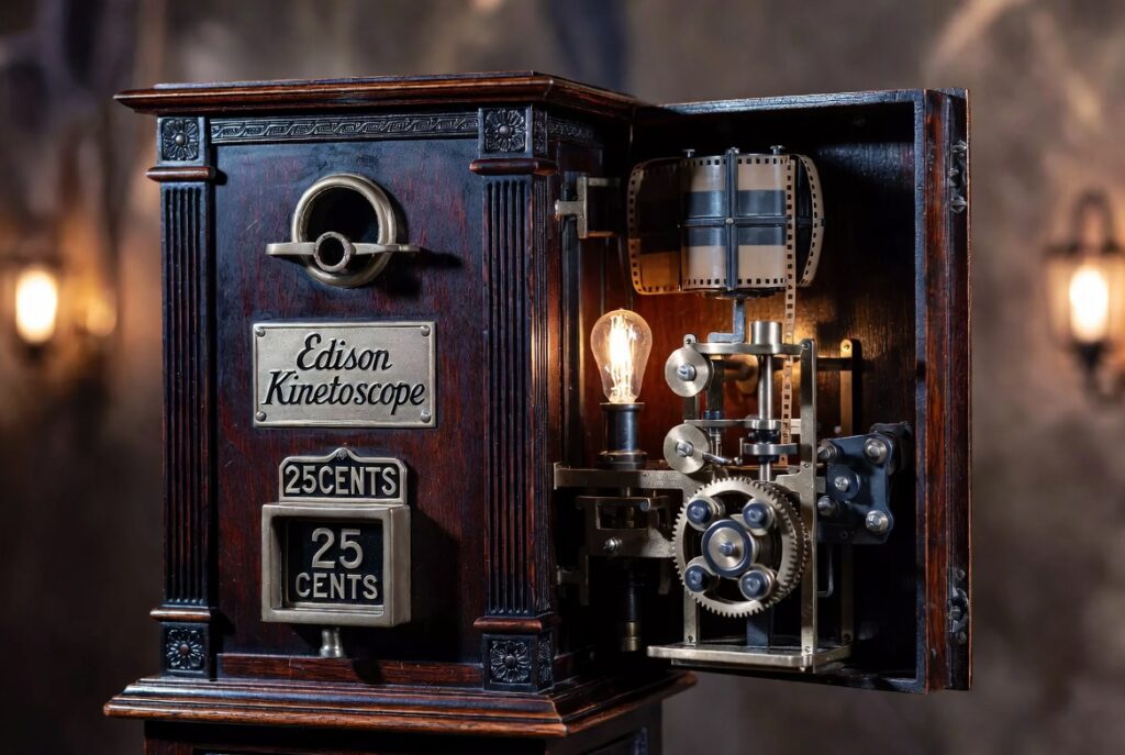 Mientras la fotografía se hacía popular, Thomas Edison quiso ir más lejos. En sus laboratorios de Nueva Jersey, su equipo (dirigido por W. K. L. Dickson) creó el Kinetoscopio: una caja alta de madera donde una sola persona miraba por una mirilla y veía 15-20 segundos de movimiento real.