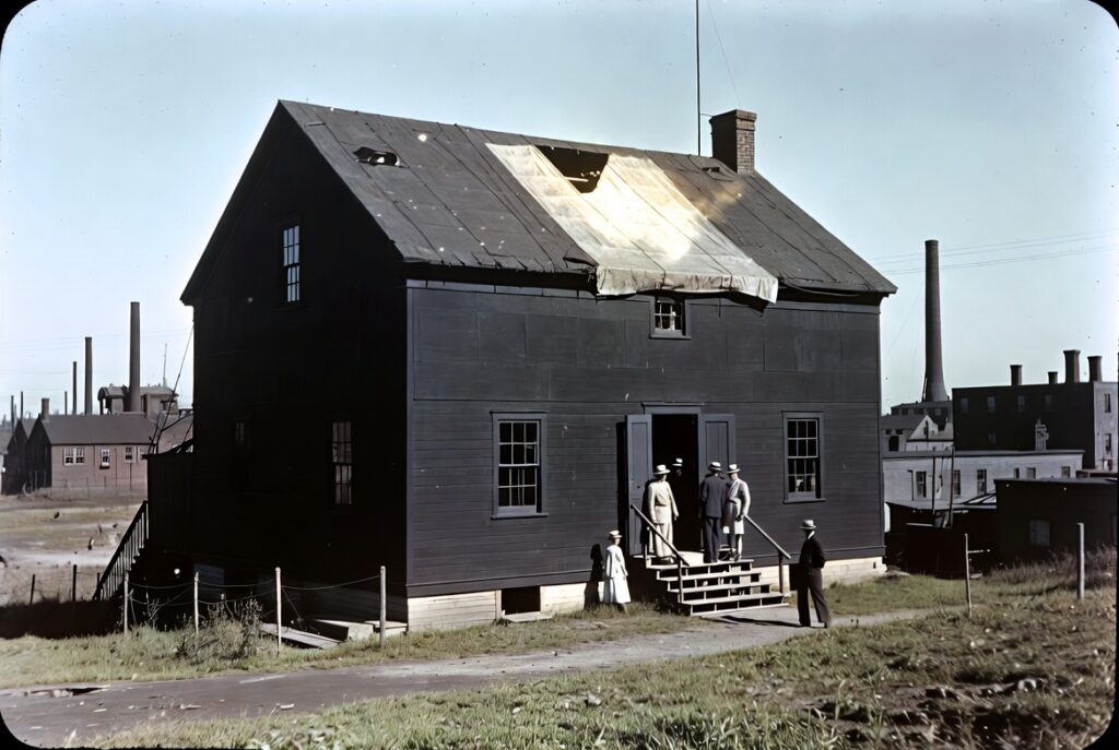 Foto histórica auténtica (1893-1894): La Black Maria original, con trabajadores y el techo abierto para dejar entrar la luz del sol.